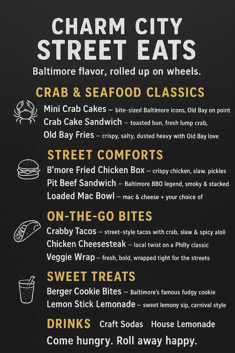 Indulge in the vibrant and savory tastes of Baltimore right here in York Pa, Baltimore, Md also to an area near you. Our food truck brings the essence of Baltimore's bistro flavors to your doorstep.
